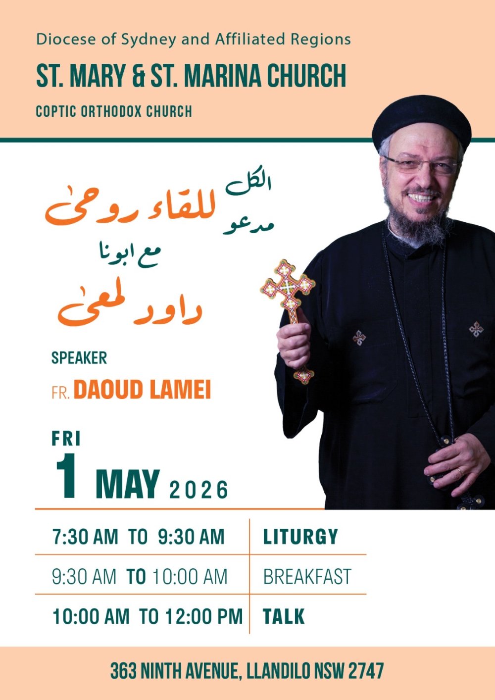 St. Mary & St. Marina Coptic Orthodox Church, Diocese of Sydney and Affiliated Regions, invites all to a spiritual gathering with Fr. Daoud Lamei